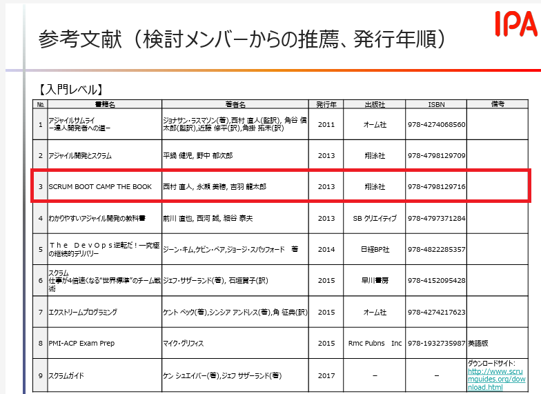 2つ目は、翔泳社の「SCRUM BOOT CAMP THE BOOK【増補改訂版】」を読むことです。この書籍は、スクラムチームの立ち上げから改善までを物語形式で学べるため、アジャイル未経験者でも実務の流れを具体的にイメージできます。さらにこの本は、IPAの「アジャイル領域へのスキル変革の指針」の参考文献にも掲載されており、信頼性の高い教材です。経験不足を知識で補うという意味で、非常に効果的でした。