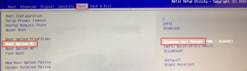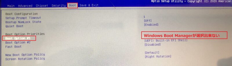 Bootタブの Boot option #1を「Windows Boot Manager」にせよ、とあるが選択肢として表示されませんでした。