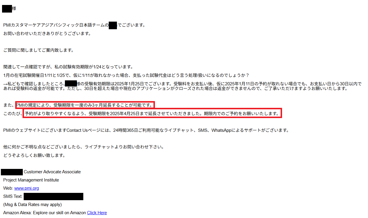 6 | PMIチームからの提案で「PMIの規定により、受験期限を一度のみ3ヶ月延長することが可能。予約がより取りやすくなるよう、受験期限を2025年4月25日まで延長させていただいた。期限内でのご予約をお願いいたします。」 |