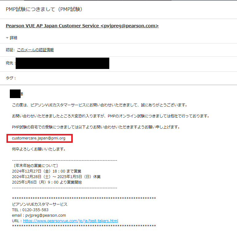 4 | ピアソンVUEカスタマーサービスに相談 →PMIカスタマーケアアジアパシフィック日本語チーム(以下PMIチーム)を案内される |