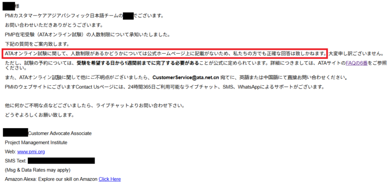 5 | PMIチームへ①自宅試験の受験数枠、②仮に支払いが終わった後に申請を進めた際に予約が取れない場合の扱いを質問 →①正確な回答は出来ない(無制限とは言えない)、②仮に2025年1月11日の予約が取れない場合でも、支払い日から30日以内であれば受験料の返金が可能。ただし、30日を超えた場合や現在のアプリケーションがクローズされた場合は返金できない。 ※下記【参考:メール】参照 |