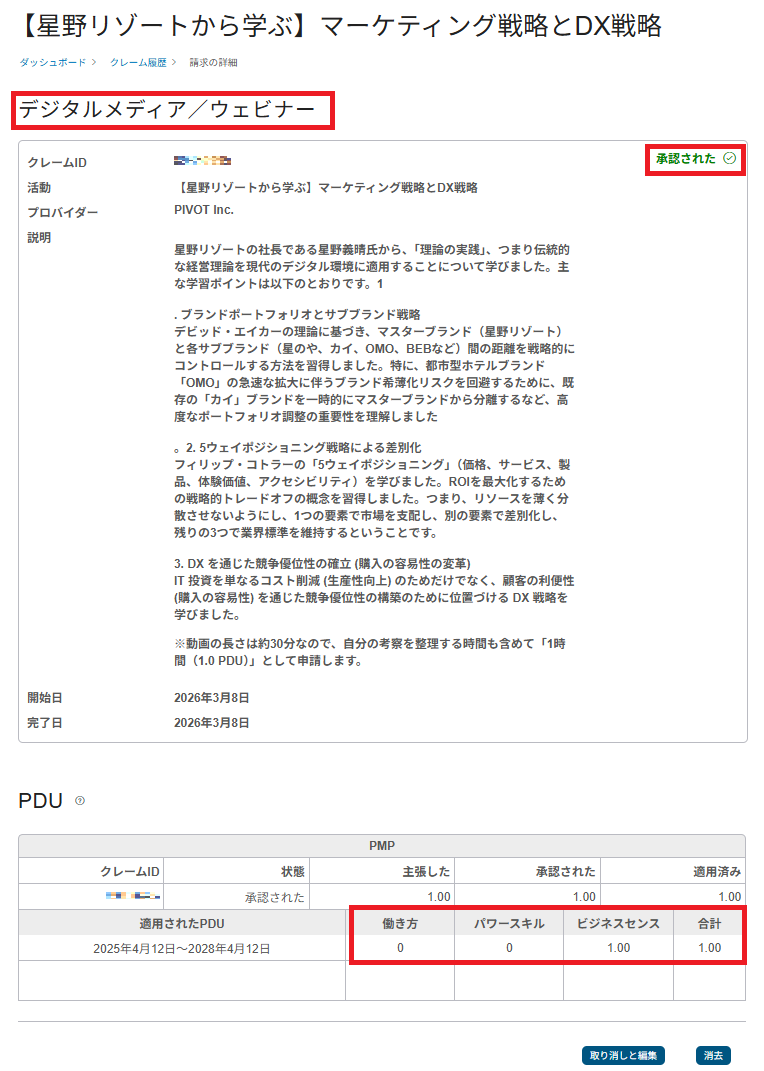 - 認められる動画: プロジェクトマネジメントの知識体系(PMBOK)に関わるもの、リーダーシップ、ビジネス戦略に関する内容であること。