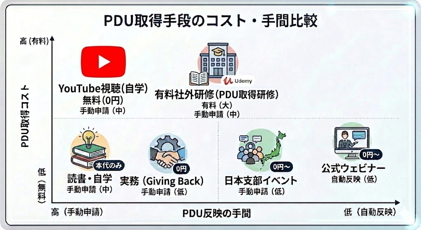 | 5 | 実務(Giving Back) | 0円 | 手動申請(低) | 現役PM・実務を有効活用したい派 |